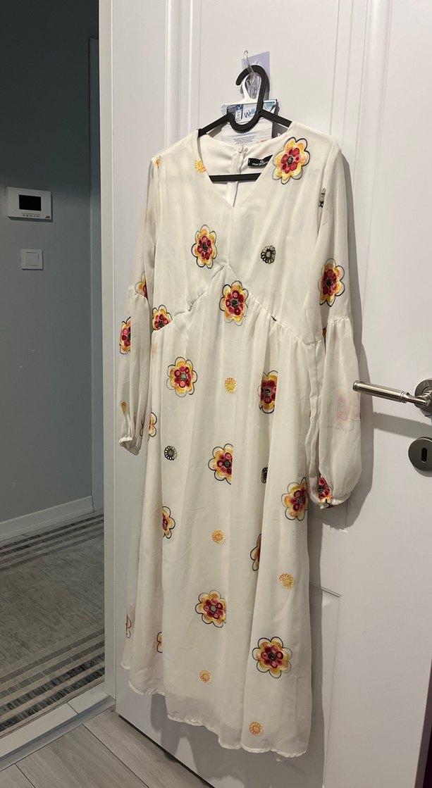 Nakışlı çiçek desenli, beyaz uzun elbise. Bol kesim, uzun kollu, V yaka ve düğmeli detaylara sahiptir. Yumuşak sentetik kumaştan yapılmıştır. Hiç giyilmemiştir