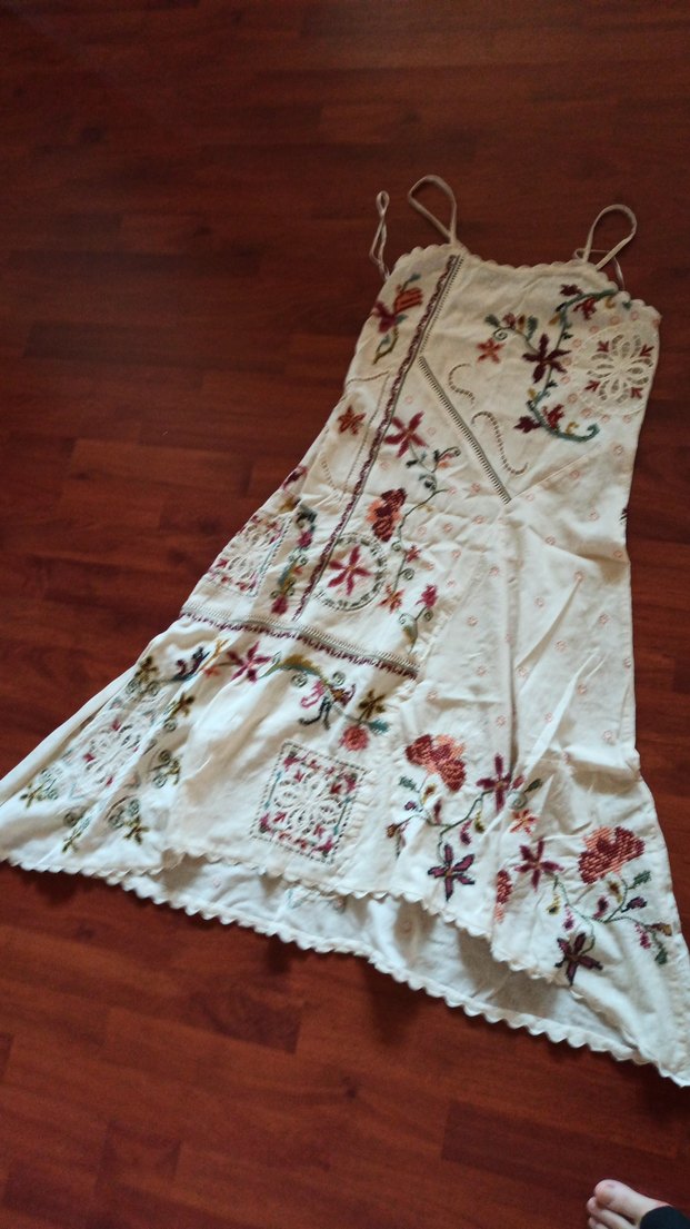 Nakışlı çiçek desenleriyle süslenmiş, askısız ve kolsuz uzun beyaz elbise. Yumuşak kumaş, bol kesim ve dökümlü tarzda, bohem düğünlere uygun.