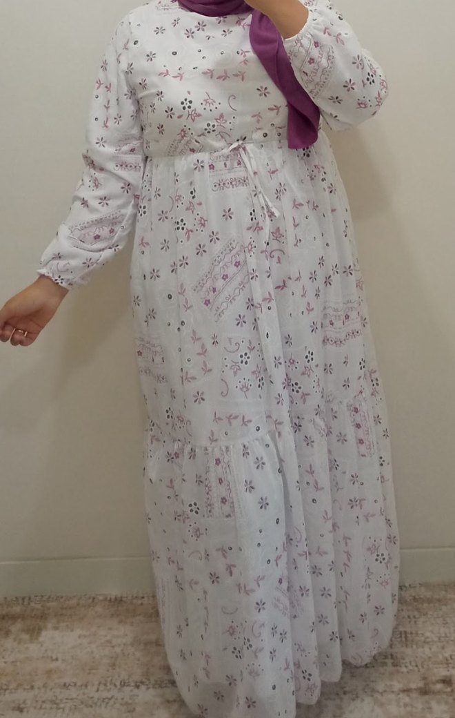Nakışlı desenlere sahip beyaz bohem uzun elbise, drapeli ve bol kesimdir. Uzun kollu ve V yaka, yumuşak sentetik kumaştan üretilmiştir.