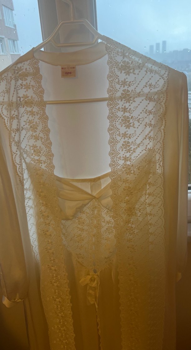 Nakışlı detaylara sahip, askılı kollu beyaz sabahlık-gecelik vintage bohem tarzında, normal midi boyda ve vücuda oturan kesimdedir.