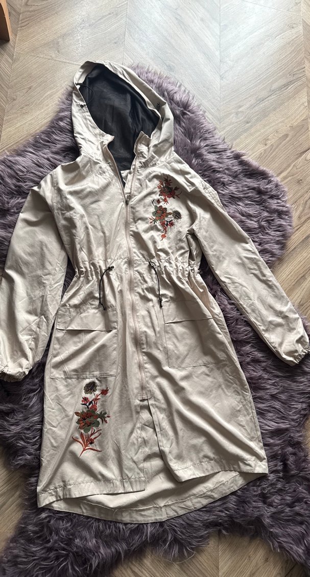 Nakışlı çiçek desenleri ve kürk detaylı, beyaz uzun kadın yağmurluğudur. Sentetik kumaştan, kapüşonlu ve bol kesimdir. Belinde bağcık vardır. ️