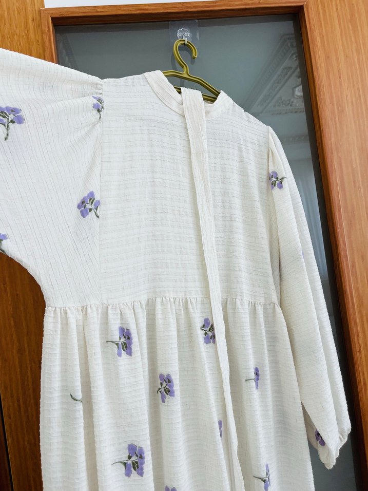 Nakışlı mor çiçeklerle süslenmiş beyaz uzun keten elbise, bol kesim, yüksek yaka, uzun kollu ve drapeli tasarıma sahip bohem tarzda.sıfır