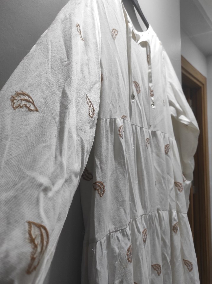 Nakışlı detaylara sahip beyaz keten uzun elbise, V yaka ve uzun kollu, bol kesim ile bohem tarzı yansıtır.