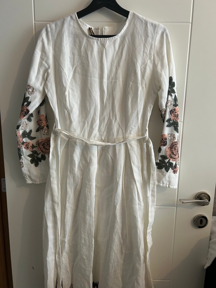 Nakışlı çiçek desenli uzun kollu beyaz keten elbise, bol kesim ve drapeli tasarıma sahiptir. Yuvarlak yaka ve kuşaklıdır, bohem tarz için uygundur.