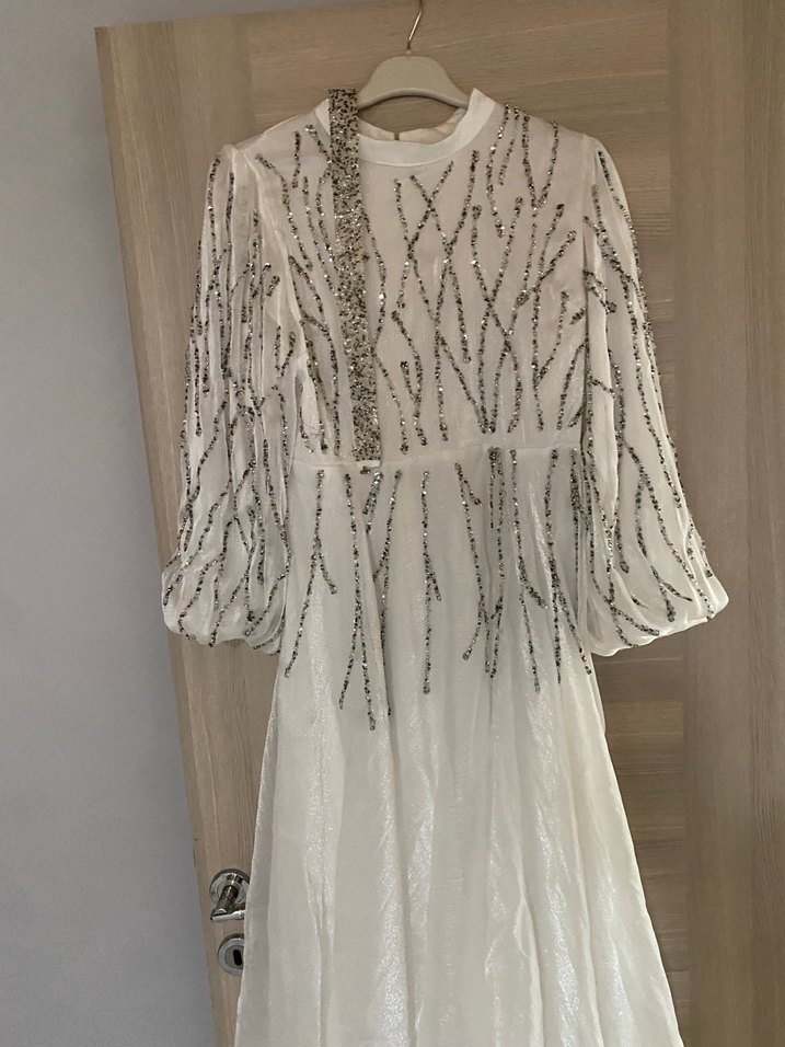 Nakışlı parlak desenlere sahip, uzun kollu ve dökümlü kesim beyaz uzun gece elbisesi. V yaka ve bohem tarzıyla düğünler için uygun. ✨