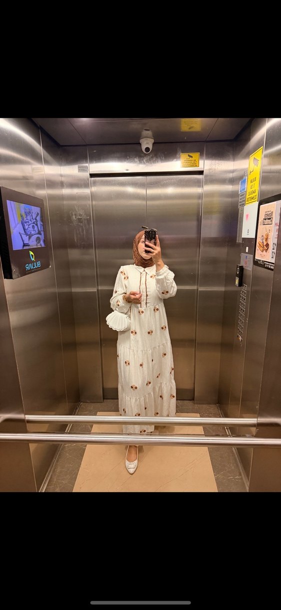 Pamuk kumaştan, nakışlı ve uzun kollu beyaz elbise. Yüksek yakalı, bol kesim ve hafif transparan tasarımıyla günlük kullanıma uygundur.