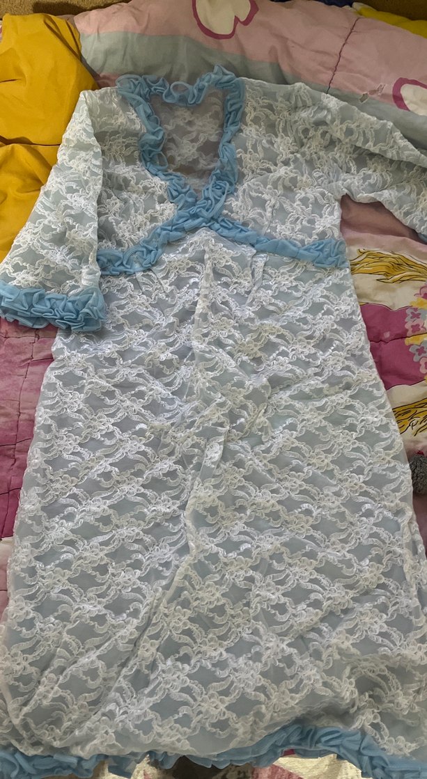 Nakışlı beyaz kumaştan, pastel mavi fırfırlı yakası ve uzun kollu, vintage bohem tarzda, vücuda oturan uzun kadın geceligi