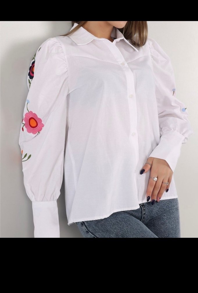 Pamuklu, uzun kollu beyaz gömlek, renkli nakışlı çiçek desenleri, yakalı ve düğmeli, salaş kesimle günlük sokak stili için uygundur.