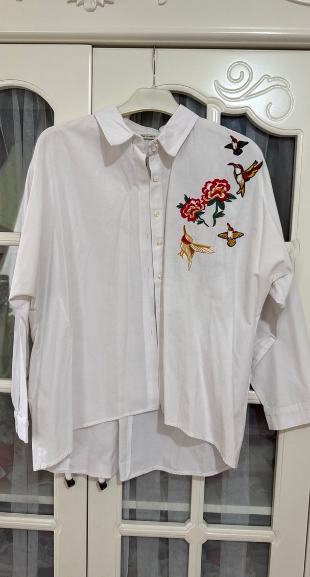 Pamuk kumaştan, düğmeli, yakalı, nakışlı çiçek ve kuş desenli, bol kesim beyaz uzun kollu gömlek. Kusursuz ve dar kesim marka temsili