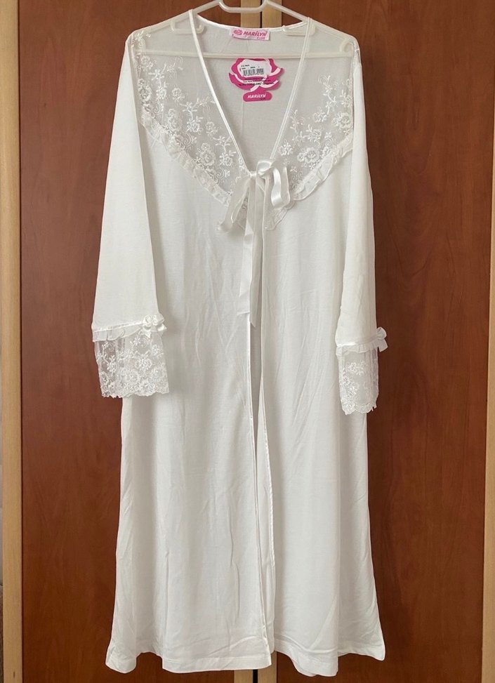 Nakışlı Beyaz Uzun Kollu Kadın Sabahlık