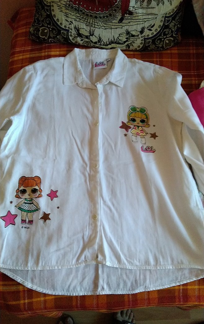 Pamuklu, beyaz renkli, yakalı ve düğmeli kız çocuk gömleği. LOL desenli, uzun kollu ve bol kesimdir. Günlük rahat stil için uygundur. Lisanslı ürün