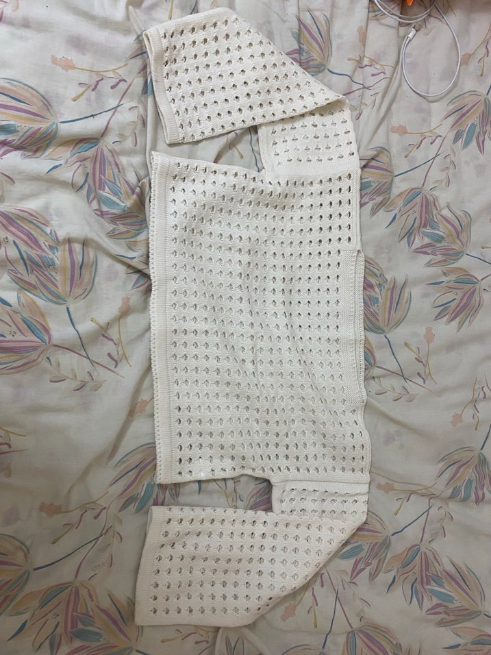 Nakışlı detaylara sahip beyaz triko hamile kazak, kayık yaka ve askılı uzun kolludur. Günlük rahatlık için regular fit sunar.