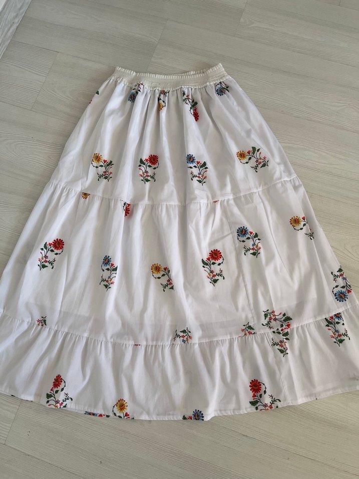 Nakışlı çiçek desenleri ve fırfır detaylara sahip beyaz uzun etek, yumuşak pamuktan ve bol kesimle bohem tarzını yansıtıyor.