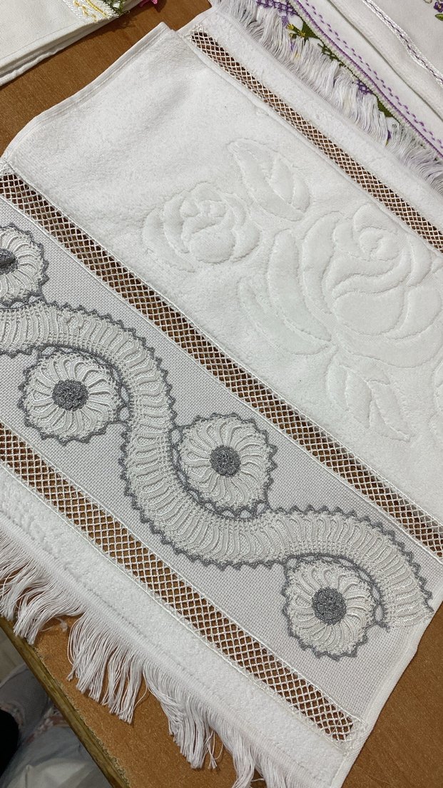 Nakışlı çiçek desenlerine sahip beyaz ve gri havlu, püskül detaylarıyla klasik tarz sunar. Yumuşak kumaştan üretilmiştir.