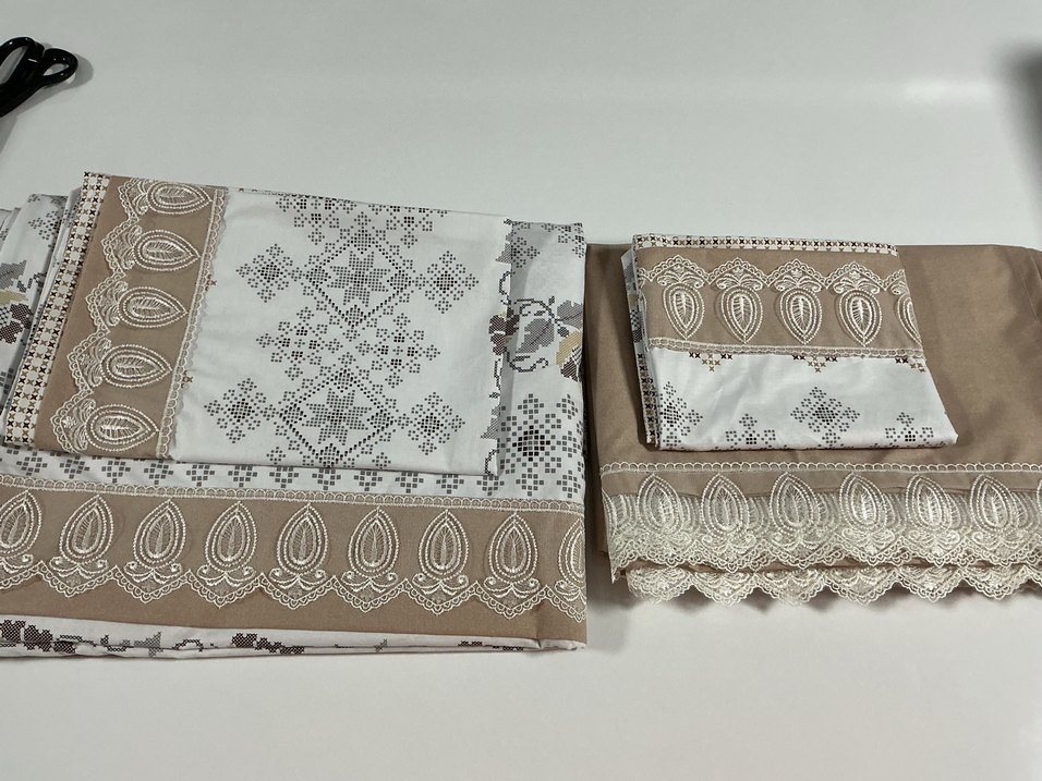 Nakışlı beyaz ve gri tonlarda nevresim takımı, bej dantel detaylarla şıklık ve doku katıyor. ️ Lastiksiz güpürlü çarşaf. Dilediğiniz ölçüde. Dilediğiniz şekilde dikim yapılabilir. Deco marka %100 pamuk kumaştır. Asla solma yapmaz