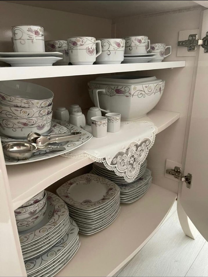 Nakışlı çiçek desenli beyaz ve gri yemek takımı, tabaklar, kaseler ve fincanlar içerir. Geleneksel tarzda, şık sunum için uygundur.taşinmadan dolayı son iki resimde küçük kusuru var.