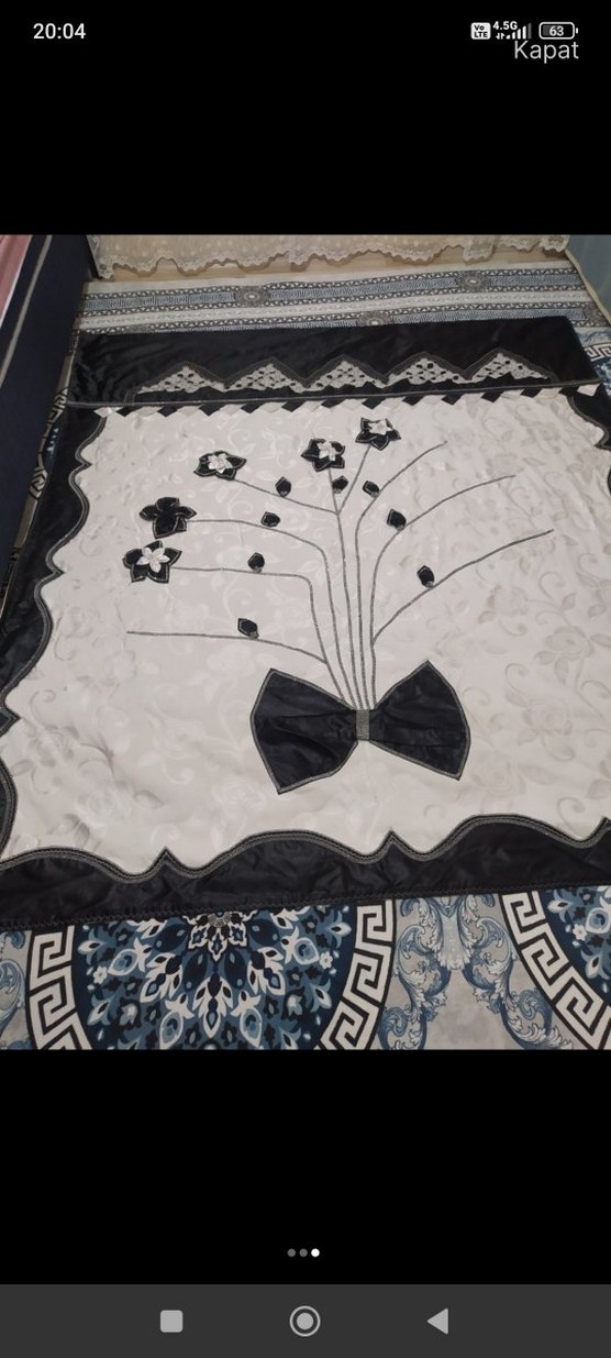 Nakışlı çiçek desenleri ve siyah fiyonk detaylarıyla beyaz zemin üzerine işlenmiş yatak örtüsü. Klasik bir dokunuş sağlar. ️