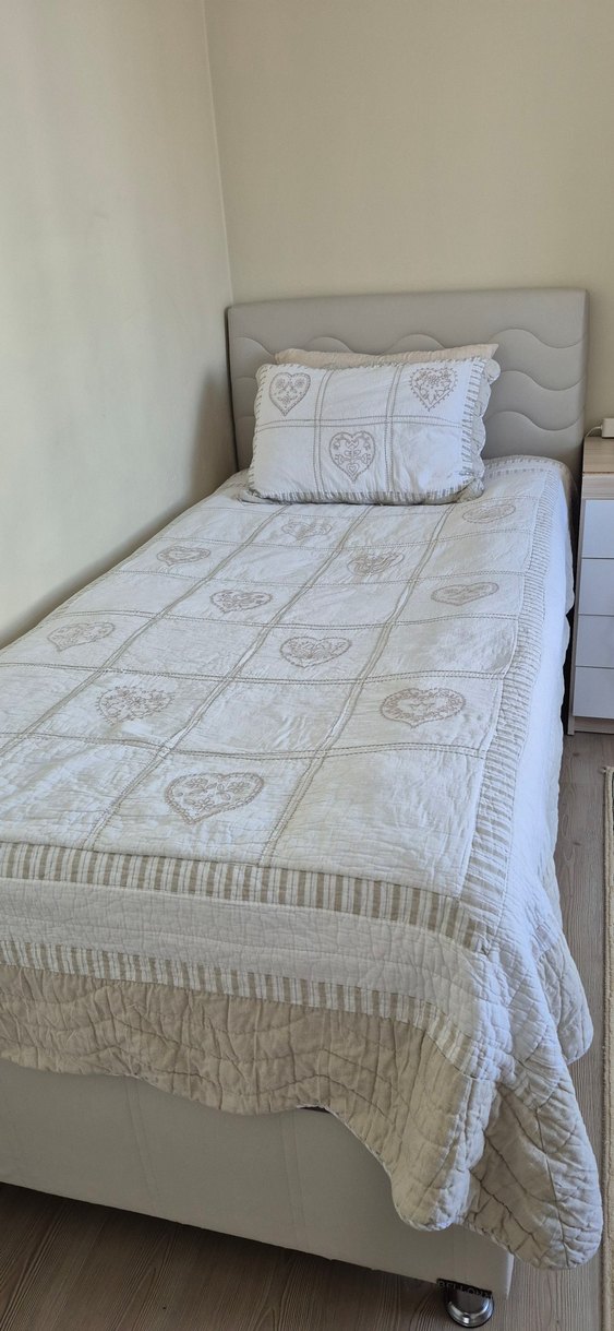Nakışlı su yeşili i kalp desenlerine sahip beyaz yatak örtüsü, yumuşak dokulu ve ince çizgili kenarlarla. yastık kılıfında ufak bir yırtık var kullanıma engel deyil ️