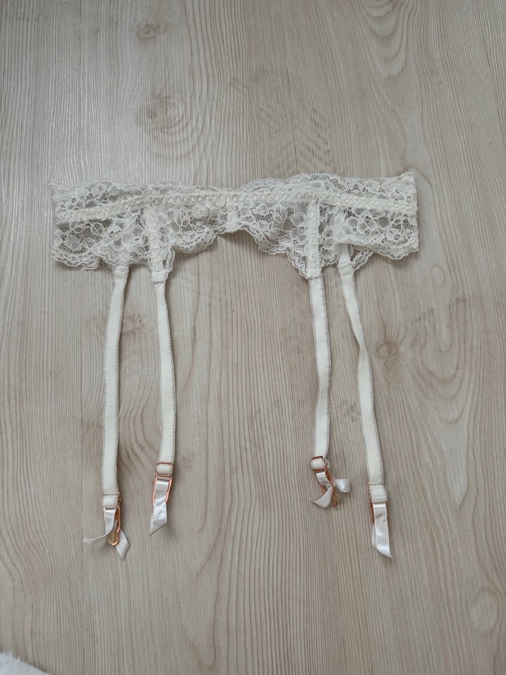 Nakışlı dantel ve ayarlanabilir askılara sahip beyaz vintage jartiyer, bohem tarzını zarif tasarımla birleştirir. Orta uzunluktadır ve yumuşak dokuludur.