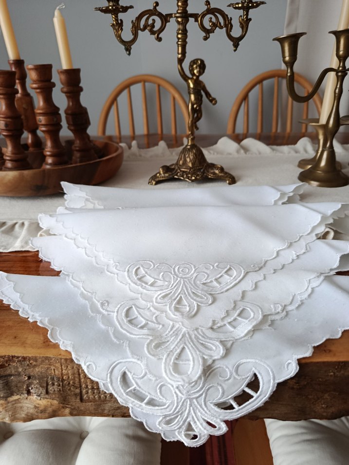 Nakışlı desenlere sahip, parlak beyaz vintage masa örtüsü, masanıza klasik bir dokunuş katıyor. ️6 adet 27 cm ebatlarında.Hafif tüylenme mevcut fakat kullanıma engel değil.Fiyatı uygun tutuyorum alıcısına hayırlı olsun.