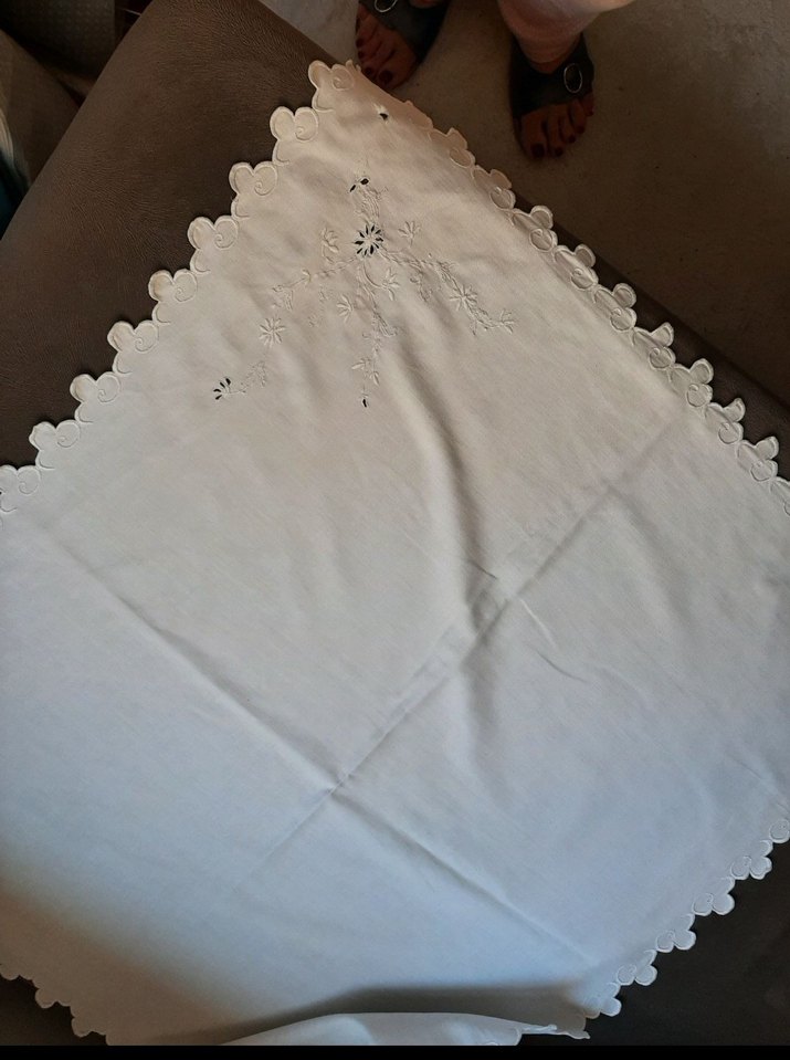 Parlak beyaz masa örtüsü, vintage nakış detayları ve dalgalı kenarlarıyla masanıza şık bir dokunuş katar. ️sarma işi işlenmiştir. bir kosesinde delik var