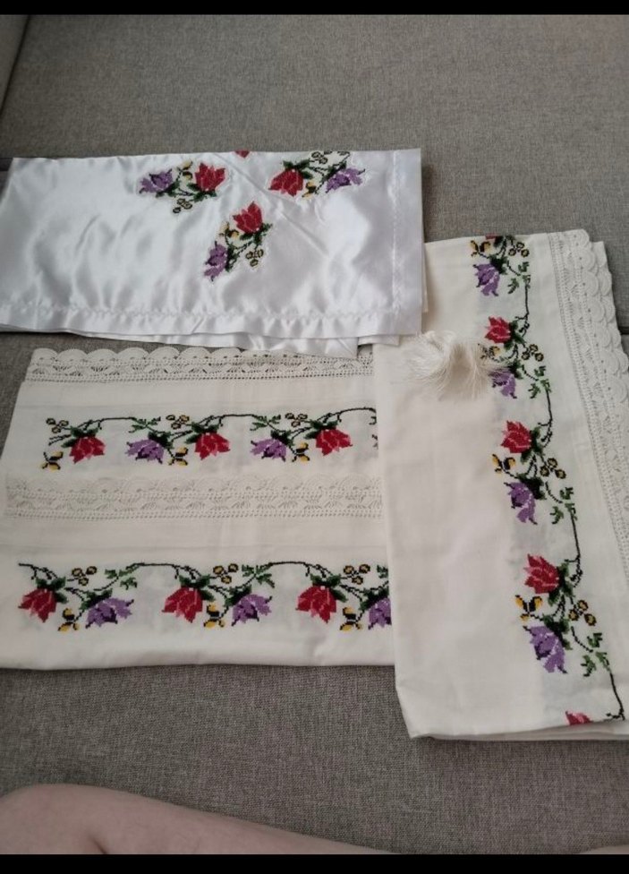 Yumuşak kumaş üzerine kırmızı, mor ve yeşil nakışlı çiçek desenleri ve dantel detayları bulunan beyaz yastık kılıfı seti. 1 etek 1 yastik ve saten bohçasi ile birlikte takim