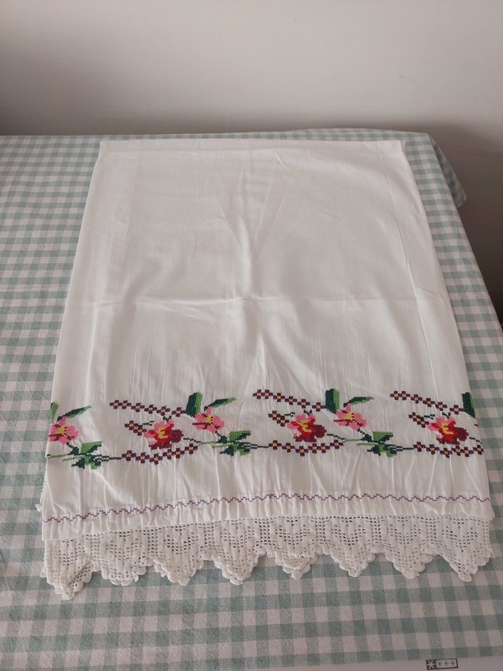 Nakışlı pastel çiçek desenleri ve dantel kenarlığı bulunan beyaz uzun yastik kılıfı. Geleneksel tasarıma ve yumuşak dokuya sahiptir.