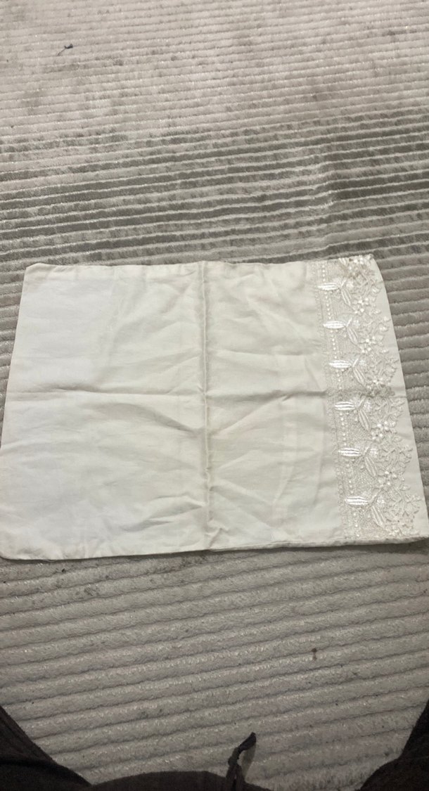Bir kenarı nakışlı beyaz yastık kılıfı, gri dokulu zeminde yer almakta. ️
