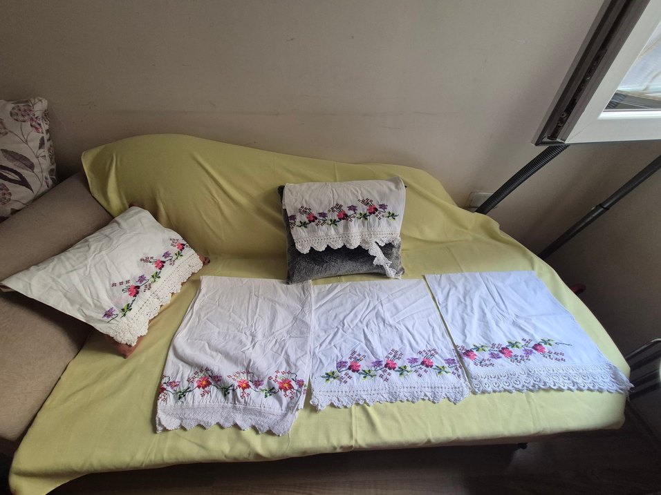 Pastel renklerde çiçek nakışlı ve dantelli kenarları olan beyaz yastık kılıfları seti, ev dekorunuza zarif bir dokunuş katıyor.