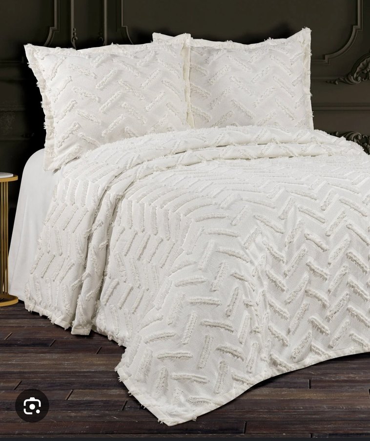 Gri tonlarda nakışlı desene sahip beyaz yatak örtüsü, uyumlu yastık kılıfları ile birlikte sunulur. ️
