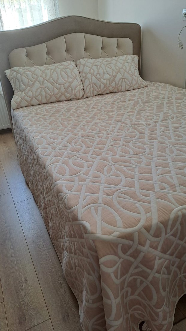 Nakışlı pastel desenlere sahip beyaz yatak örtüsü, yatak odasına zarif bir dokunuş katar. Yumuşak dokulu ve şık tasarımlı.