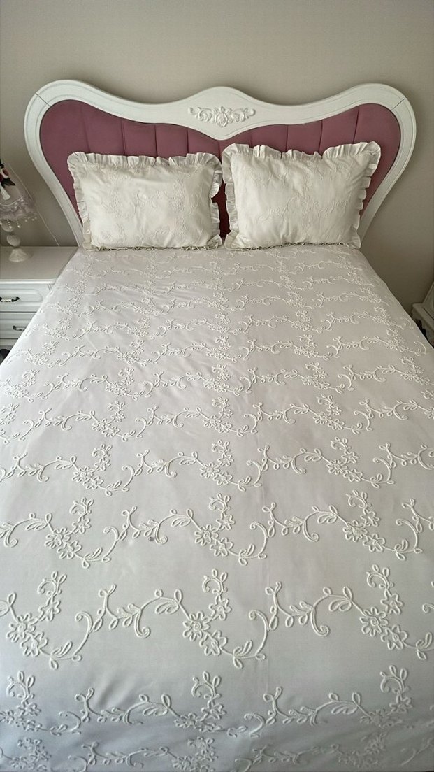 Zarif nakışlı çiçek desenleriyle beyaz yatak örtüsü, uyumlu yastık kılıflarıyla birlikte. Yumuşak krem ton yatak odasına şıklık katıyor. ️