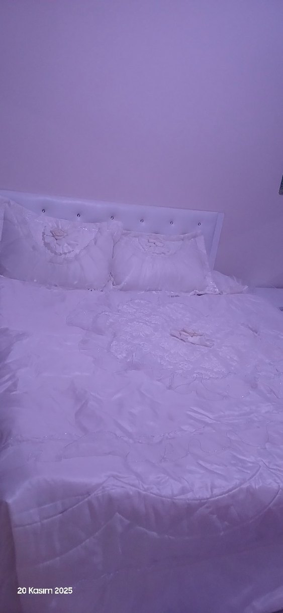 Nakışlı desenlere ve uyumlu yastık kılıflarına sahip beyaz yatak örtüsü. Pastel ton yumuşak ve zarif bir hava katıyor. ️çeyizliik