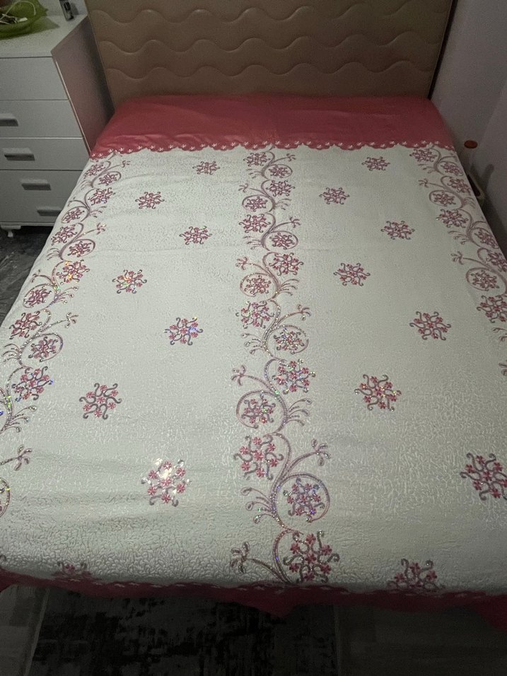Pastel renkli nakışlı çiçek desenleriyle beyaz yatak örtüsü, yatak odasına zarif bir dokunuş katıyor. Çeyizim için yaptırmıştım kullanamadım özel dikim 235* 223 cm