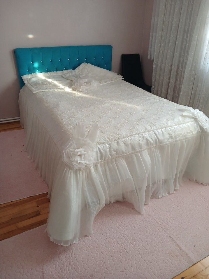 Nakışlı detaylara sahip beyaz yatak örtüsü, yumuşak ve fırfırlı kenarlarıyla yatak odasına zarafet katar ️.