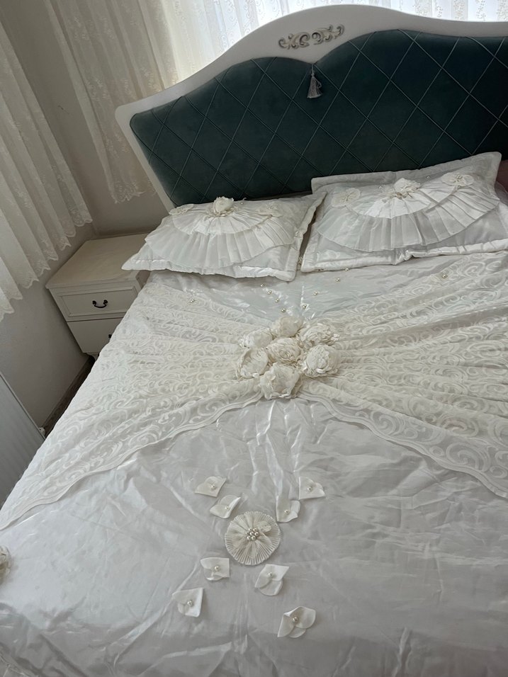 Yatak odasına zarif bir dokunuş katan nakışlı çiçek desenli beyaz yatak örtüsü. Uyumu sağlayan yastık kılıfları mevcuttur.