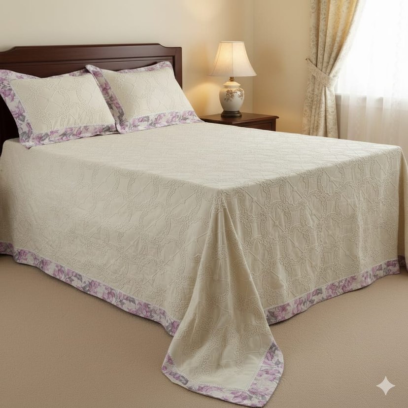 Nakışlı beyaz yatak örtüsü, pastel çiçekli kenar süslemeleriyle yatak odasına yumuşak bir dokunuş katıyor.