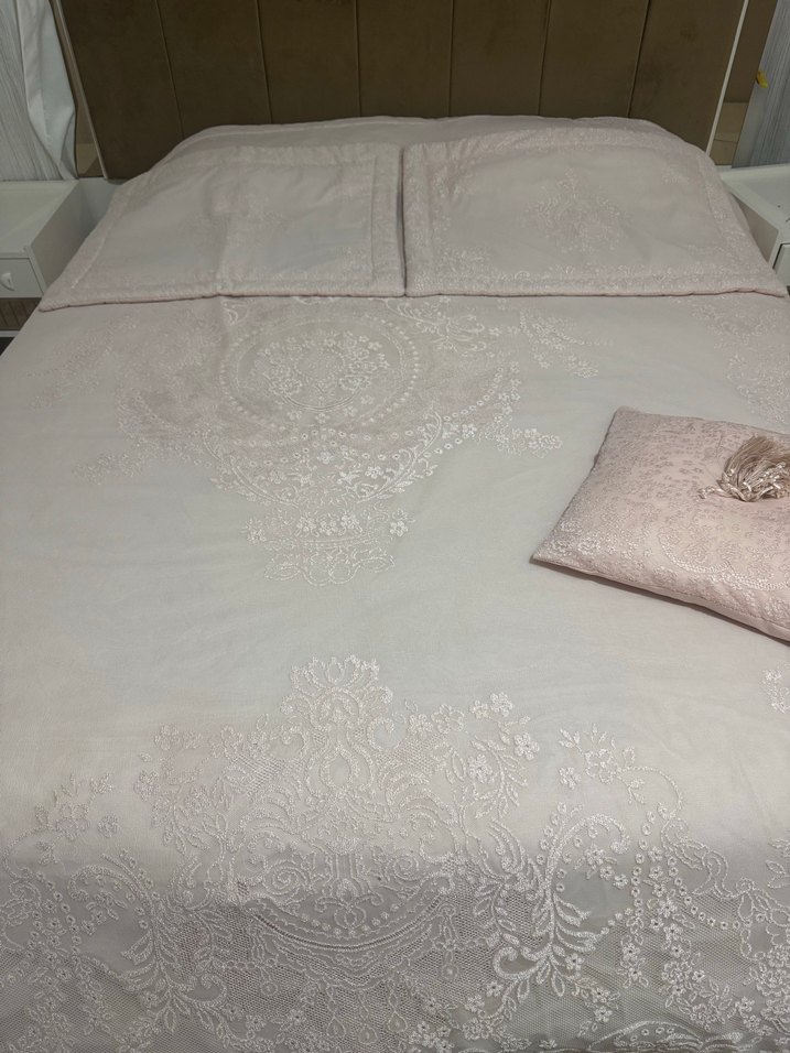 Yumuşak pastel beyaz kumaş üzerine zarif nakış desenleriyle süslenmiş yatak örtüsü, yatak odanıza ince bir şıklık katıyor. ️