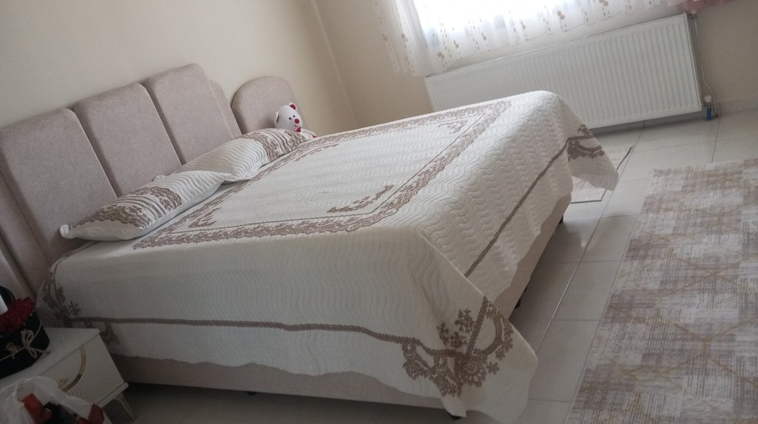 Hafif tonlarda nakışlı desenlere sahip beyaz yatak örtüsü, zarif ve şık bir görünüm sunar. ️