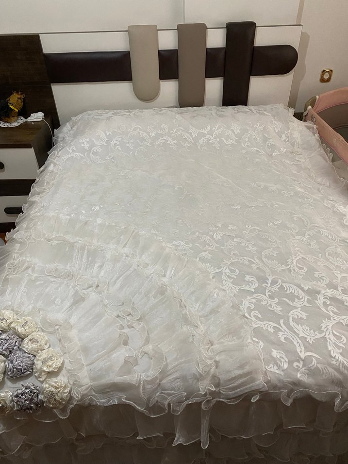 Nakışlı desenlere sahip beyaz yatak örtüsü, hafif ve zarif dokusuyla dikkat çeker. Kabarık çok sık yatak örtüsü yastıklarıda var 1defa kullandım kadırdım tertemiz
