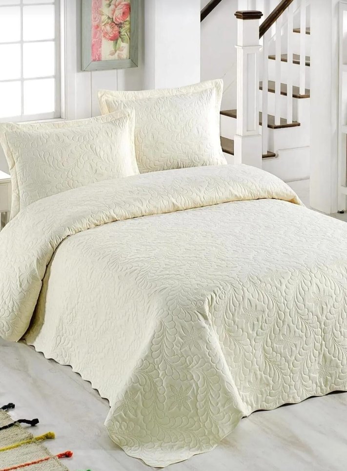 Bu beyaz yatak örtüsü, zarif nakışlı desenlerle hafif doku ve şıklık katıyor. Rosa Ultrasonic pamuklu çift kişilik 3 parça yatak örtüsü 230×240 cm