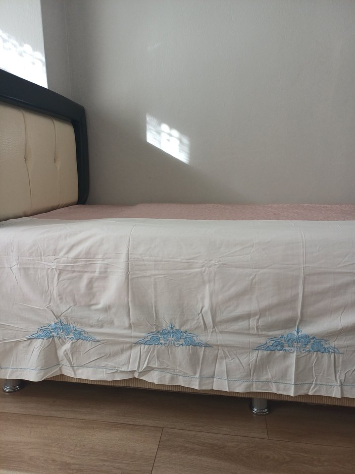Yatak kenarlarında pastel mavi nakış detayları bulunan beyaz yatak örtüsü. ️tekli satistadir boy 2 07cm en 79 cm iade kabul etmiyorum Bilerek alım yapınız