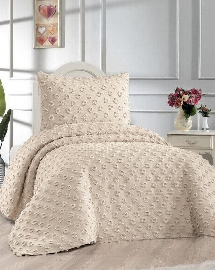 Nakışlı desenlere sahip, pastel tonlarda beyaz yatak örtüsü ve çarşaf takımı, yumuşak dokulu bir görünüm sunar. Ponpon Tek kisilik 2 parça yatak örtüsü 180×250cm Battal boy