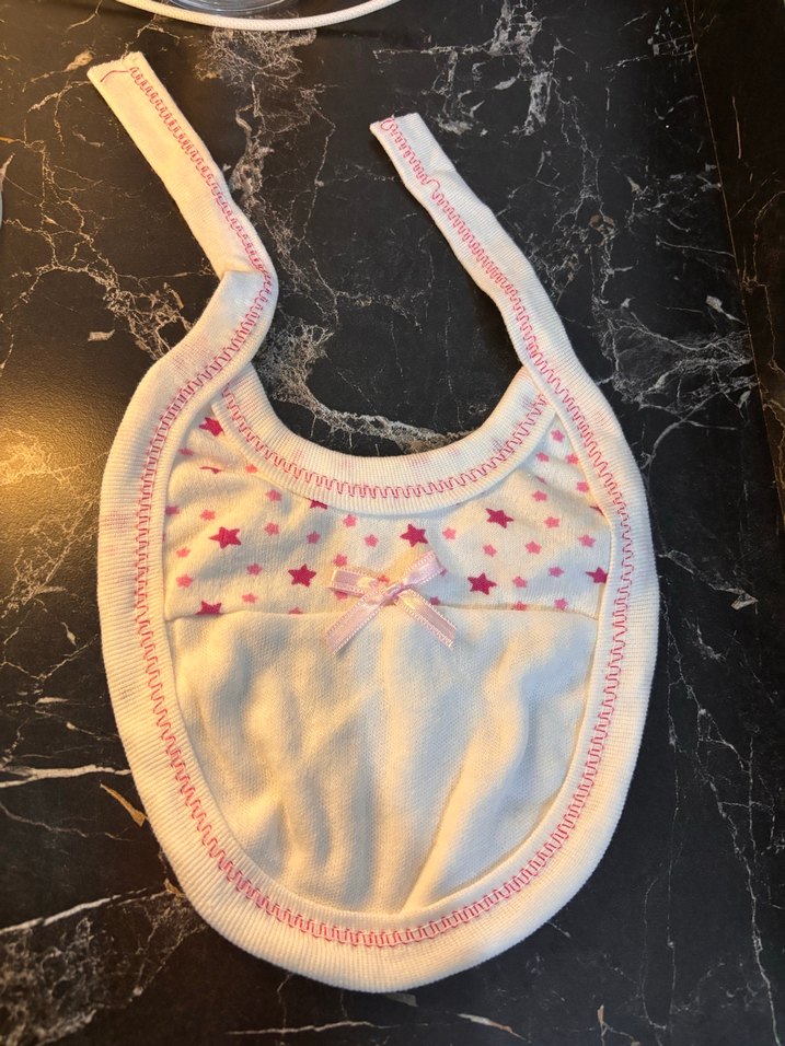 Pastel nakışlı yıldızlar ve pembe dikiş detaylı beyaz bebek önlüğü, küçük pembe fiyonk süslemeli. Yumuşak kumaştan üretilmiştir.