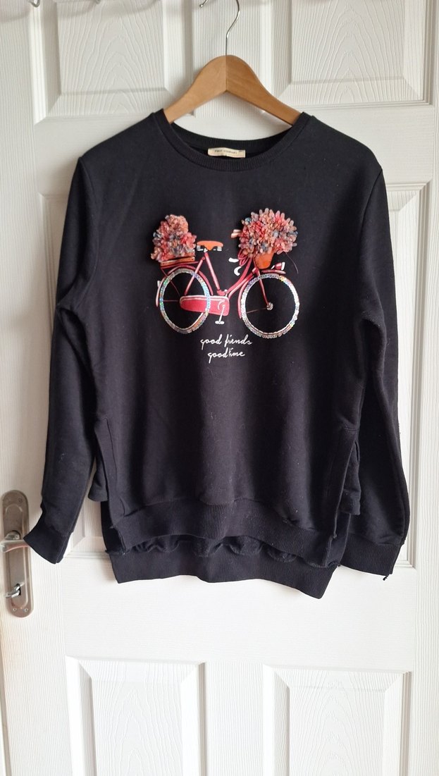 Pamuklu, uzun kollu, bisiklet yaka ve bol kesim kadın sweatshirt. Örgü detaylı, bisiklet baskılı ve 3D işlemeli tasarım. Günlük kullanıma uygun koyu renk.