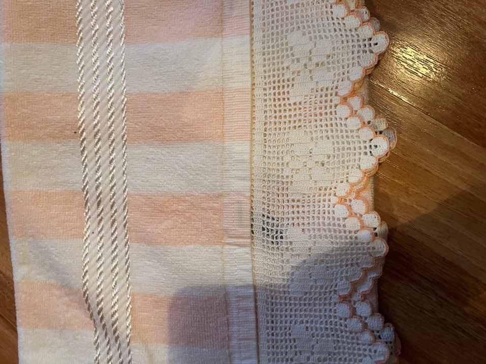 Bu bej havlu, pastel renkli çizgiler ve nakışlı dantel detaylarıyla bohem tarz sunar. Yumuşak ve şık bir tasarıma sahiptir.