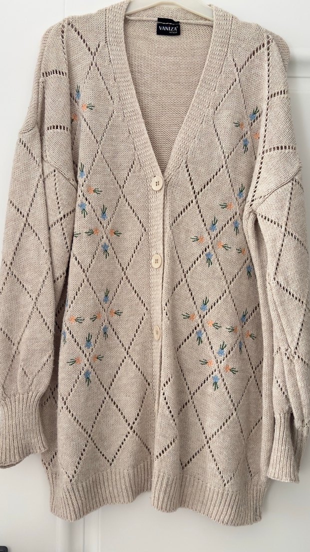Bej renkli, uzun kollu, notlu yaka tasarımlı, bol kesim, yumuşak örgüden yapılmış nakışlı çiçek desenli bohem tarzında, günlük kullanıma uygun hırka.