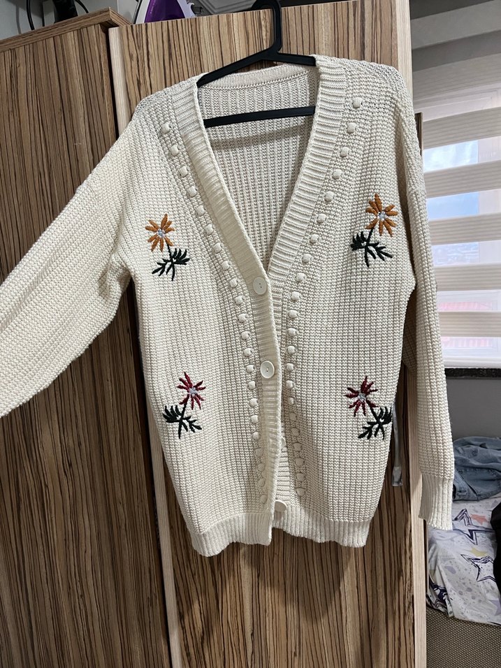 Nakışlı çiçek detaylı, uzun kollu, V yaka beyaz örme hırka. Salaş kesim ve midi boyda, bohem tarzda rahat bir seçenek.
