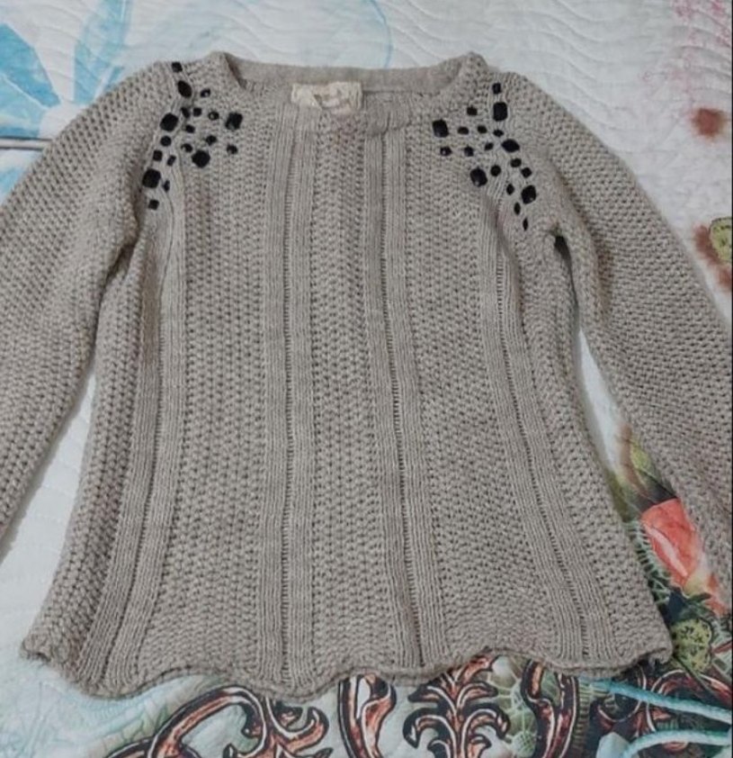 Uzun kollu, yuvarlak yakalı bej örme kazak, nakış detaylarıyla bohem tarzı yansıtıyor. Rahat kesimli ve günlük kullanıma uygun.