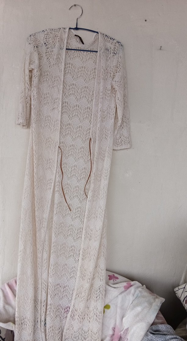 Uzun, bol kesim bej kadın elbisesi nakışlı desenlere ve uzun kollara sahip, bohem tarzını yansıtıyor. s.m bedene uyımlu